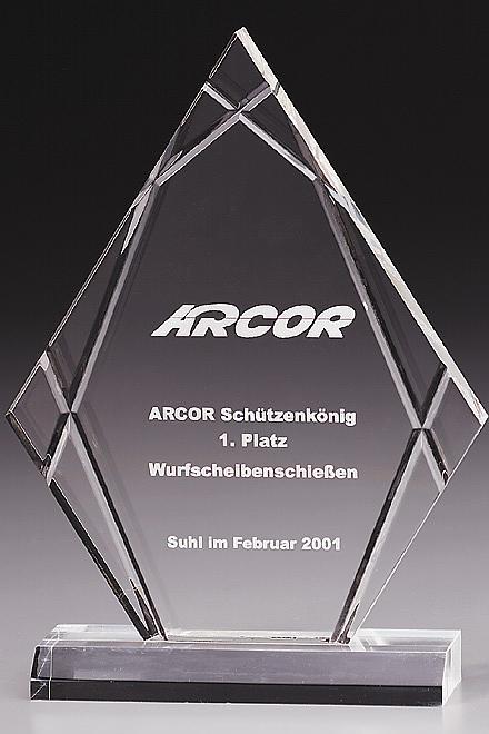 Effektvolle Zierfräsungen, hochglanzpoliert, geben dieser Trophäe ein extraordinäres Design. Hochwertige Verarbeitung des 18 mm starken Acrylglases.