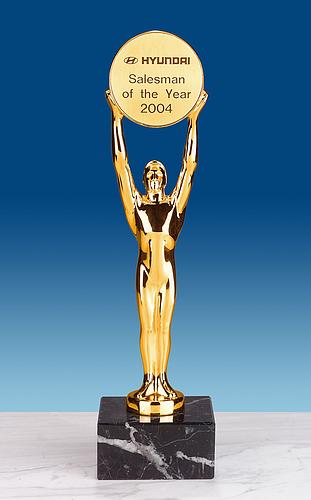 Eine exklusive und universelle Trophäe aus massivem Metallguss, vergoldet, auf einem Sockel aus schwarzem Marmor; inklusive goldfarbener Gravurscheibe für Ihre individuelle Gestaltung!