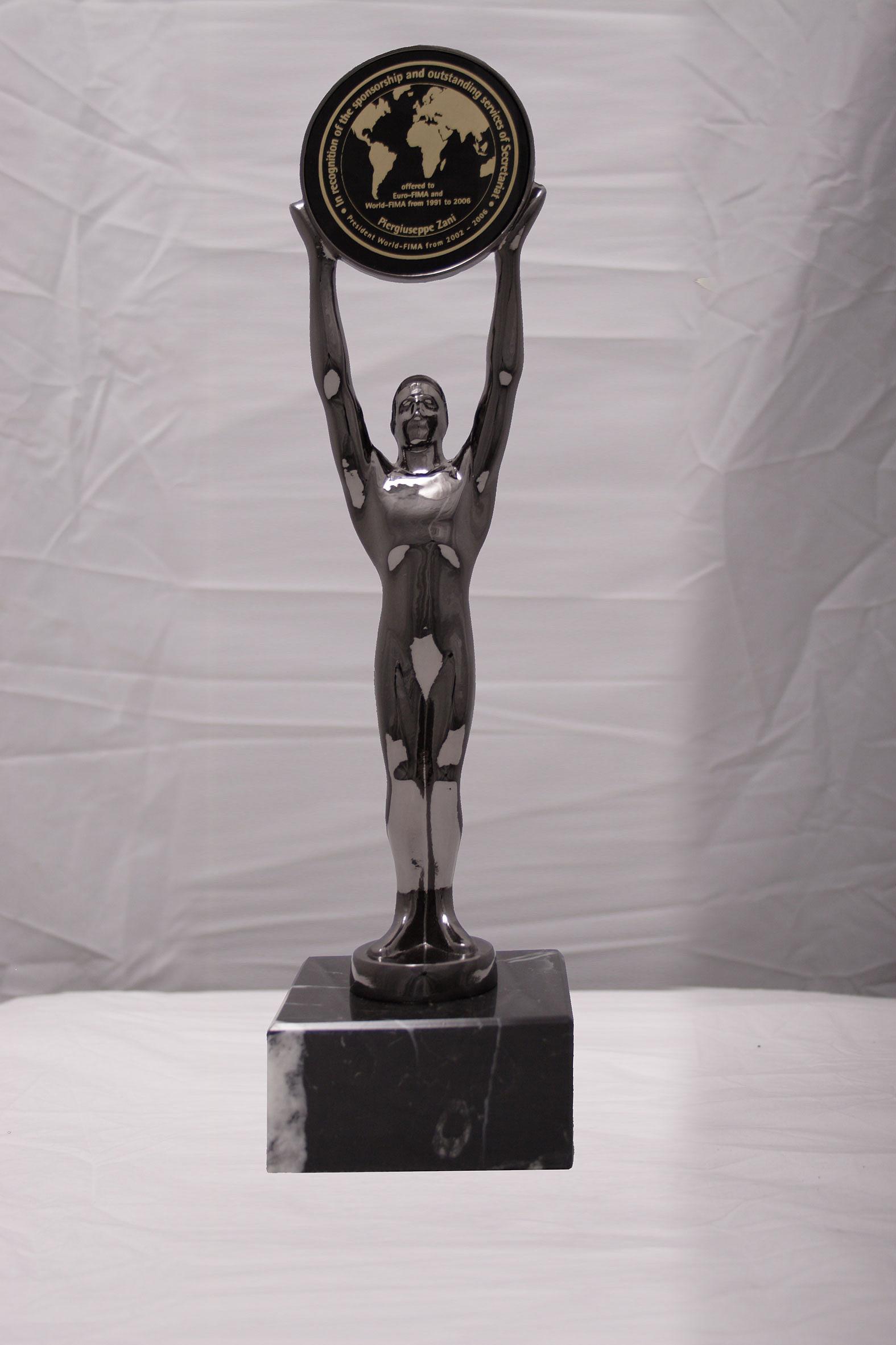 Eine exklusive und universelle Trophäe aus massivem Metallguss, Aranja, auf einem Sockel aus schwarzem Marmor; inklusive Gravurscheibe für Ihre individuelle Gestaltung!